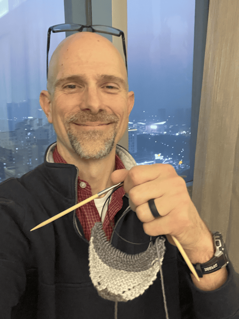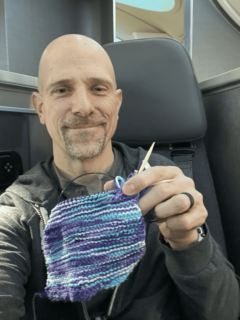 That’s exactly where I was as I was trying to finish my first knitting project ever, a simple dishcloth, while flying to China for my day job.