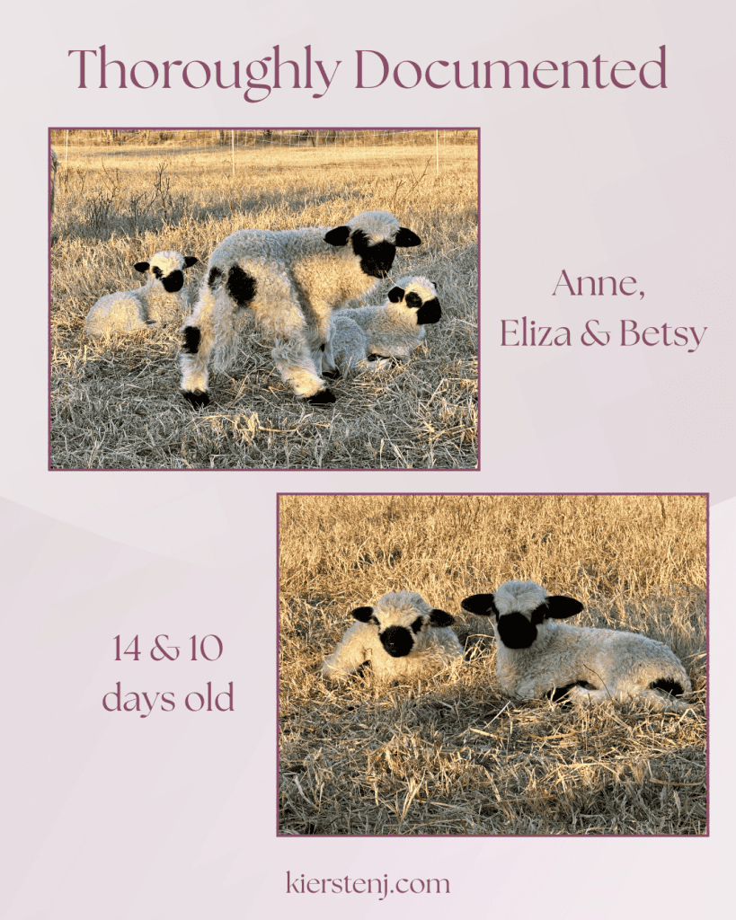 We have completely filled our phone memories and cloud memories with photos and videos of the sheep making themselves at home. As expected, the wee ones are hogging the spotlight. I wonder if this experience is similar to human babies, when the first ones get loads of documentation and the later ones somewhat less? We’ll see. For now, we’re building an embarrassingly thorough photo library of lamb growth and development. If you need a stock photo of a black and white lamb standing, sitting, grazing, nursing, dozing, chewing, peeing, pooping, frolicking, wandering, baaing, or various other things, alone or in company, send up a flare. I probably have it.